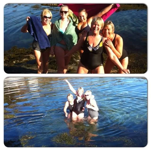 -De tøffe damene er medlemmene i Costa del Sør-Halsnes badenymfeforening på Tustna på Nordmøre. Dette bildet er tatt skjærtorsdag og det var 6 grader I sjøen, forteller Lisbeth Hultgreen, som er en av de gale damene.