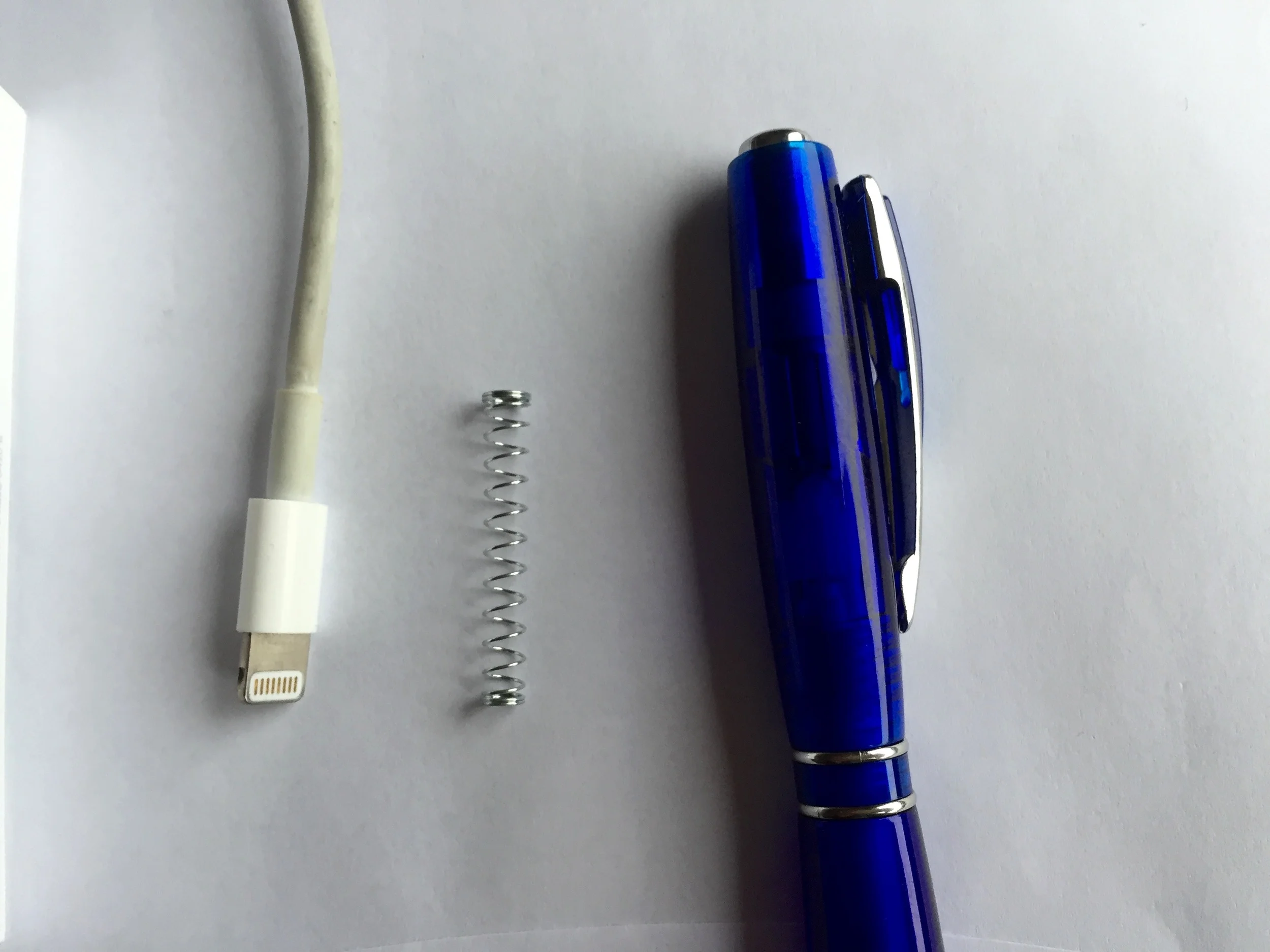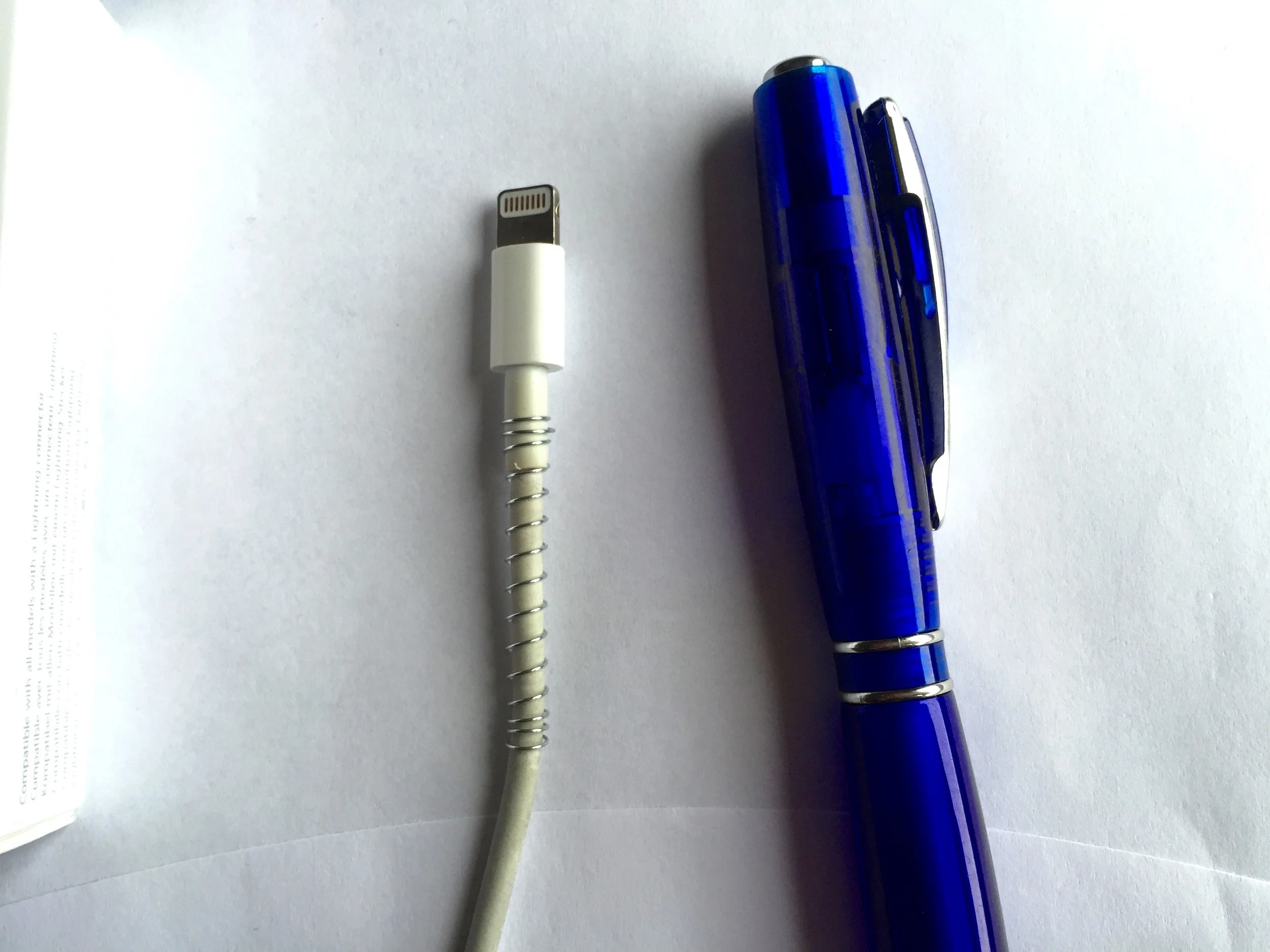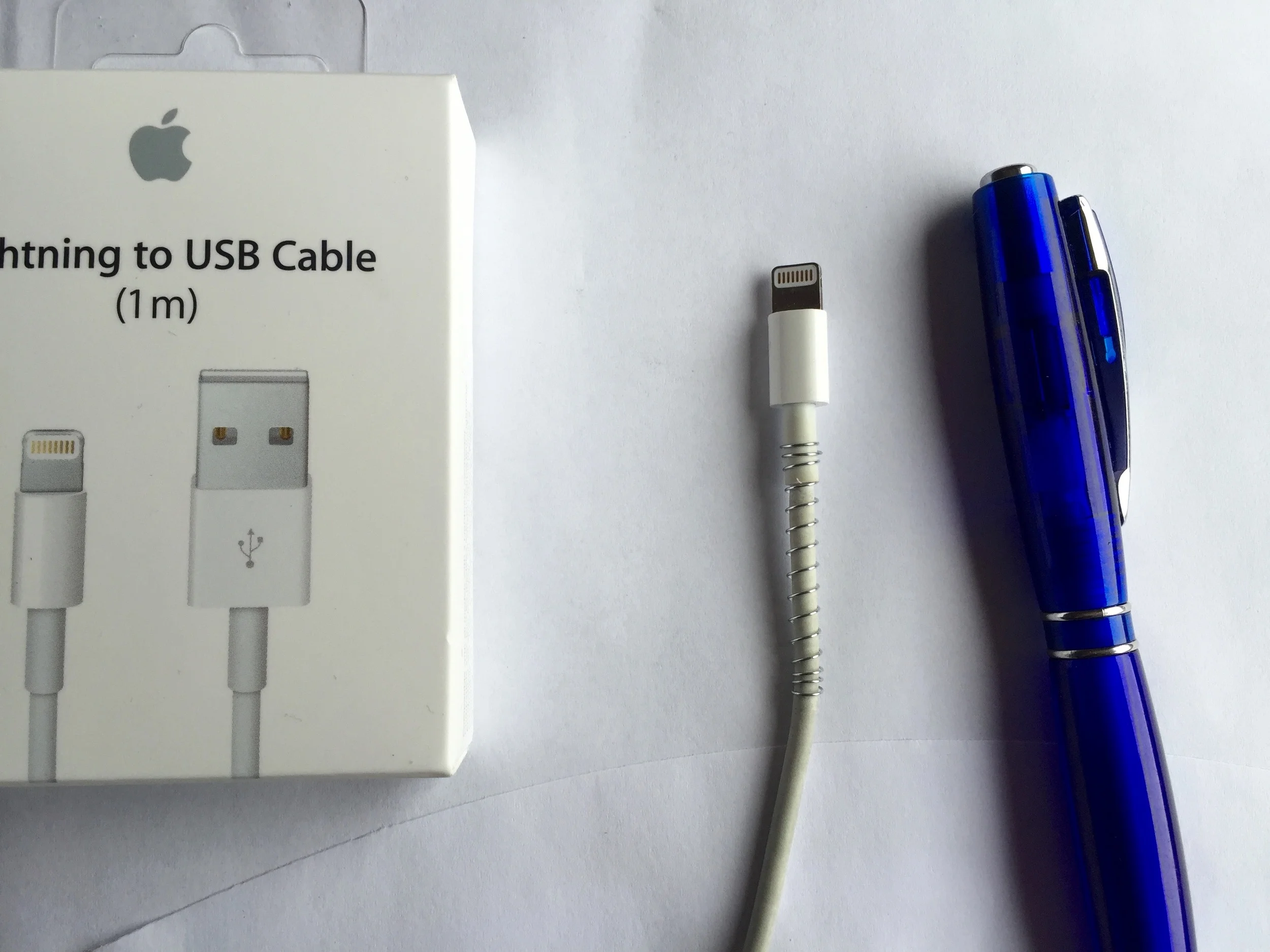 Ta en enkel kulepenn av den typen som har en spiralfjær inne i plastikken. Ta ut spiralfjæra og tvinn spiralfjæren rundt ledningen. Sørg for at den ene enden av fjæren er inne på den tykkeste delen av ladeledningen (se bildet). Nå vil ikke ledningen brekke, slik den har en egen evne til på alle reiser. Vips, så er problemet løst.