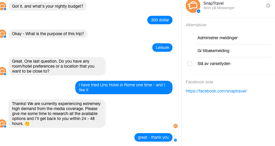 Nå bruker vi vanligvis Messenger til å sende beskjeder til, eller å ha små samtaler med venner og familie. Dersom du vil ha hjelp i jakten på hotellrom kan du bruke SnapTravel.