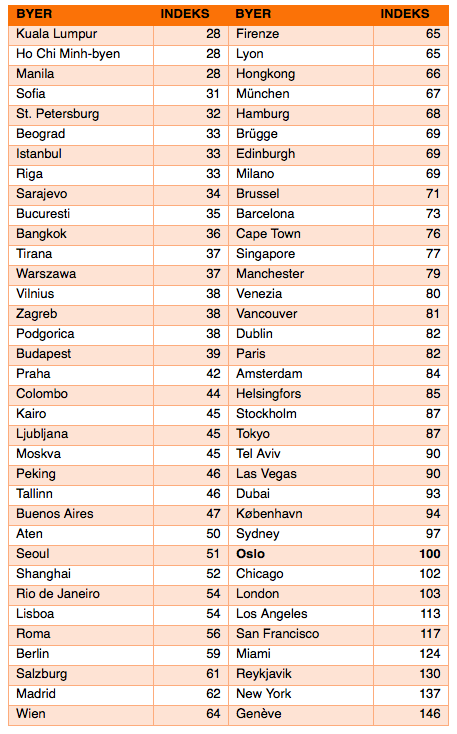 De tre byene Kuala Lumpur i Malaysia, Ho Chi Minh-byen i Vietnam og Manila på Filippinene er de tre storbyene som kommer billigst ut i Forex banks storbyindex for våren 2017. Kuala Lumpur har en indeks på 28 sammenlignet med Oslos 100.