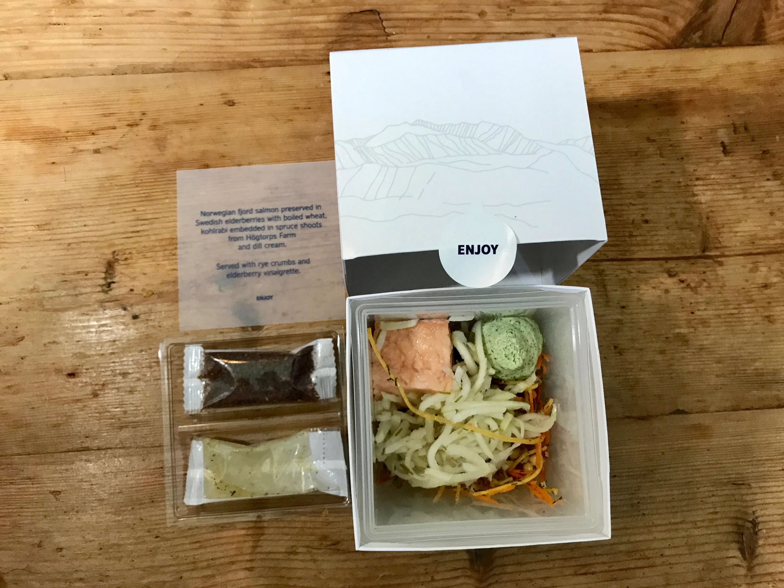 Kuben skal være innpakning for frokoster og lunsjen på flyvningene. Og inne i denne finner du blant annet norsk laks, dansk kalvekjøtt eller svensk lam. Dette er i kombinasjon med ulike grønnsaker og krydder fra det nordiske kjøkkenet. Norsk brunost og eplejuice er også noe av de du finner i boksene.