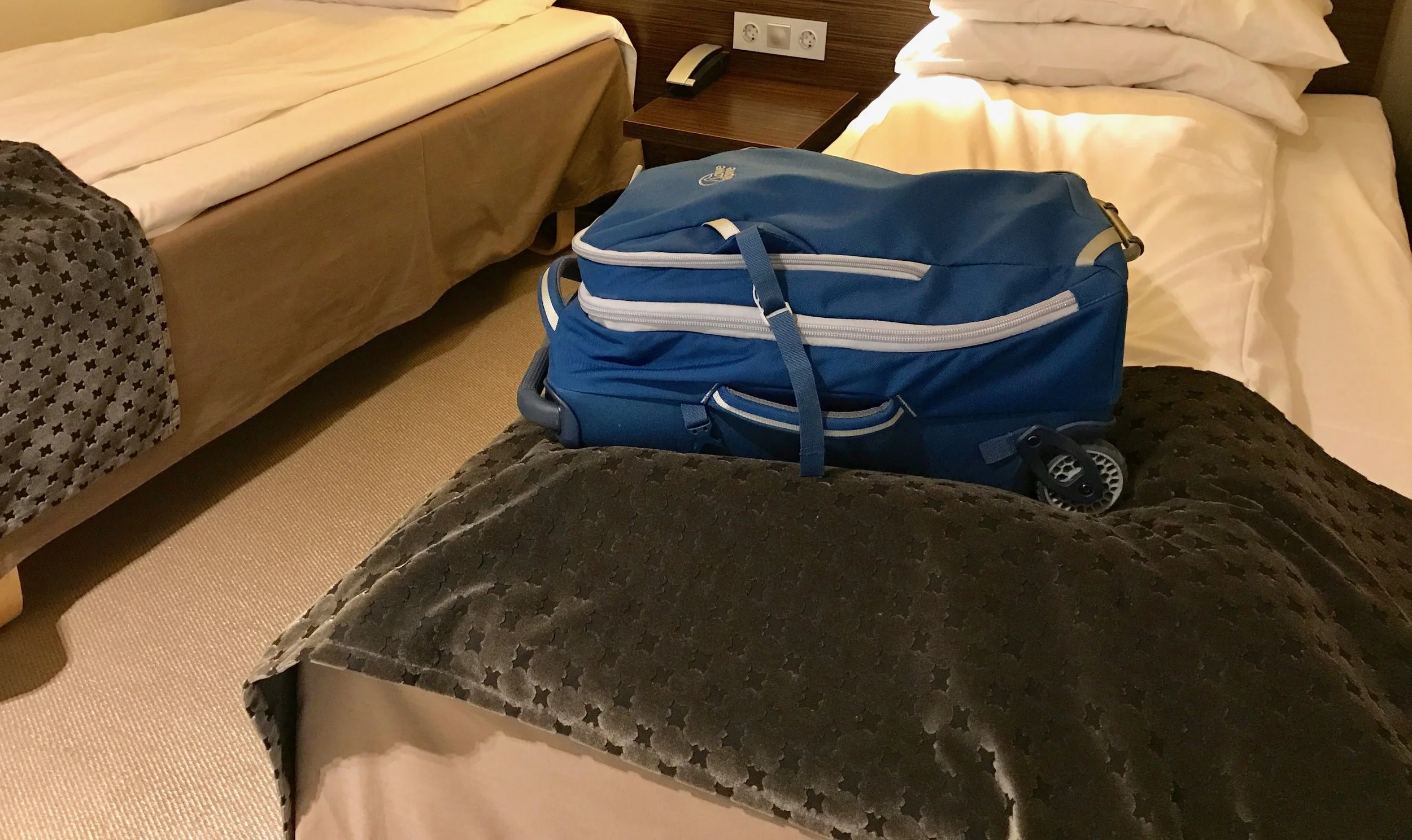 Nei, du skal ikke legge kofferten din på senga. Bruk koffertstativet eller aller helst badet. Foto: Odd Roar Lange