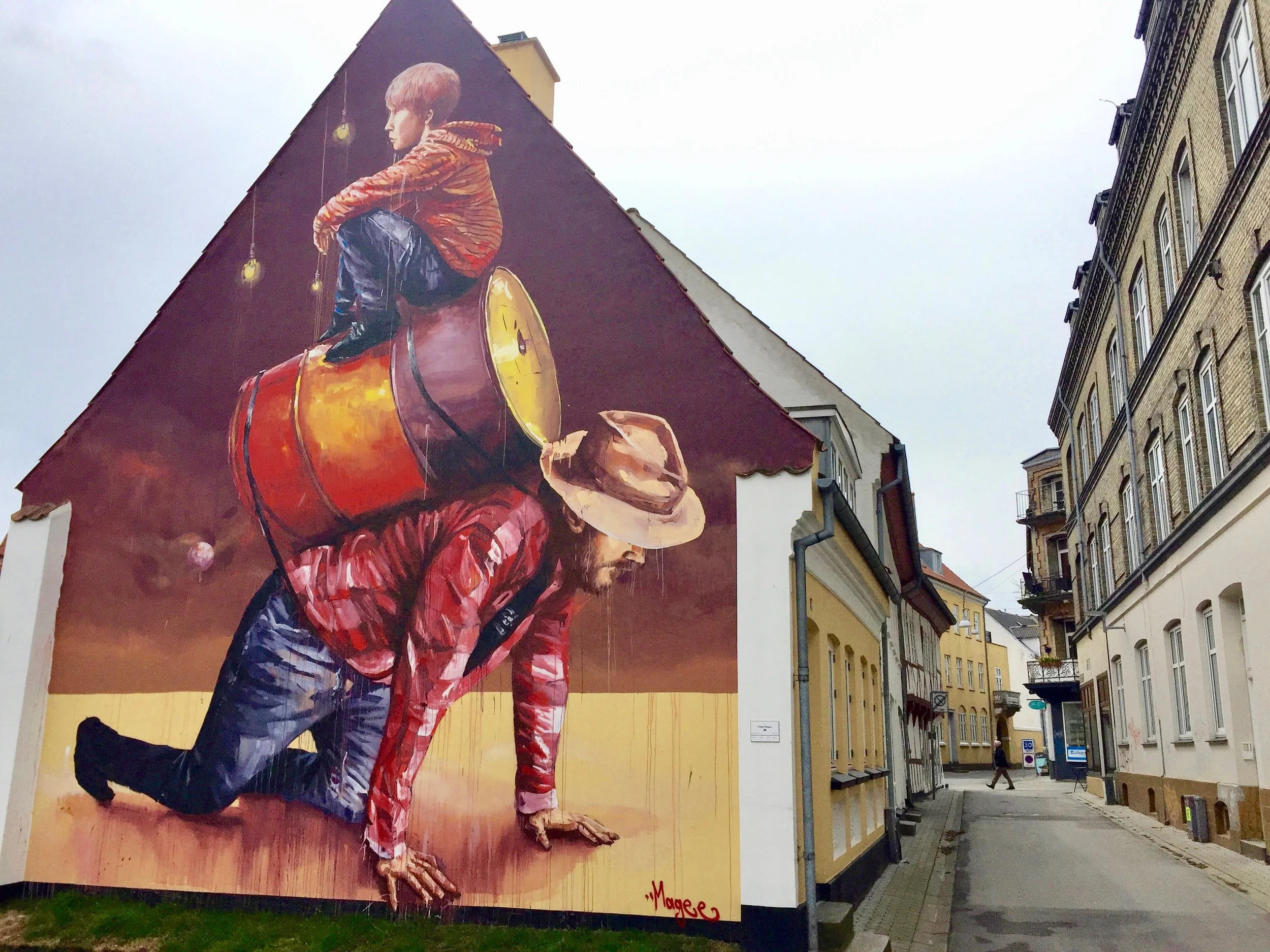 i Aaborg, som jeg har hatt stor glede av å besøke flere ganger, er mer enn 50 kunstverk malt på veggene. Dette gjøres i samarbeid med eieren av huset. Og så kan turistkontoret samle turene i egne kunstturer.