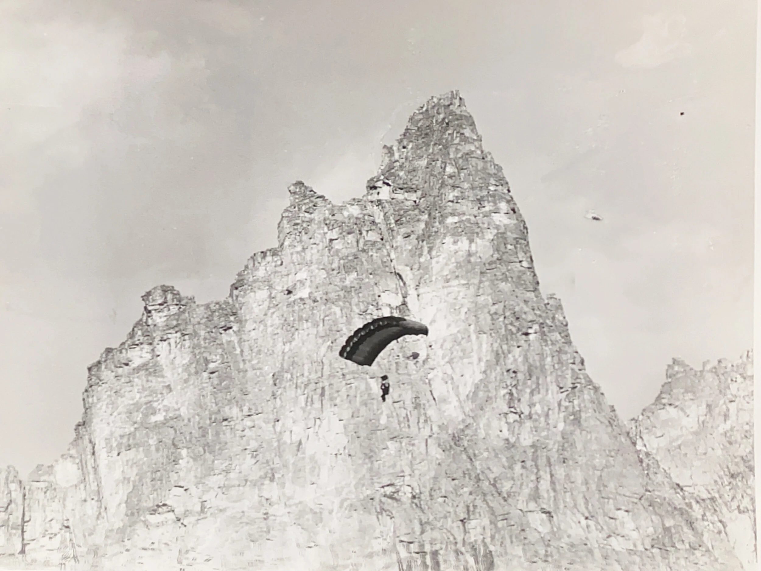 Herfra var det 600 meter loddrett fjellvegg. Trygt nok for basehopping, med den tids utstyr (i dag brukes vingedrakter som løfter hopperen ut fra fjellet).