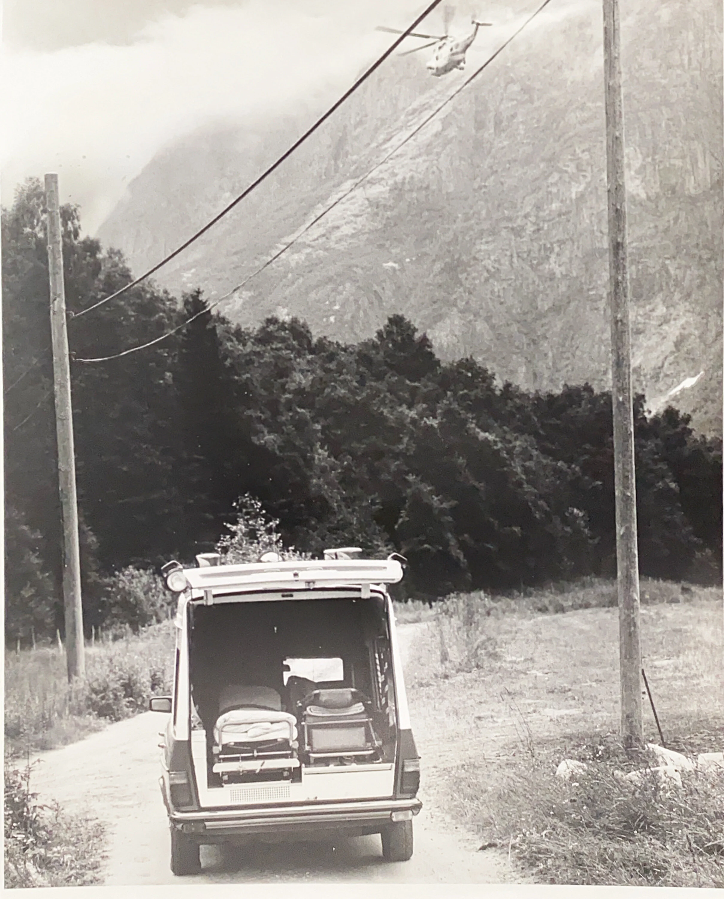 Bildene: Sea King-helikopteret er på på plass og skal snart hente den døde Carl Boenish fra fjellsida under Stabben. Dagen etter må kona Jean ta farvel med ektemannen i kapellet ved Molde Sykehus. Alle foto: Odd Roar Lange (Klikk på bildene for å se dem i større format)