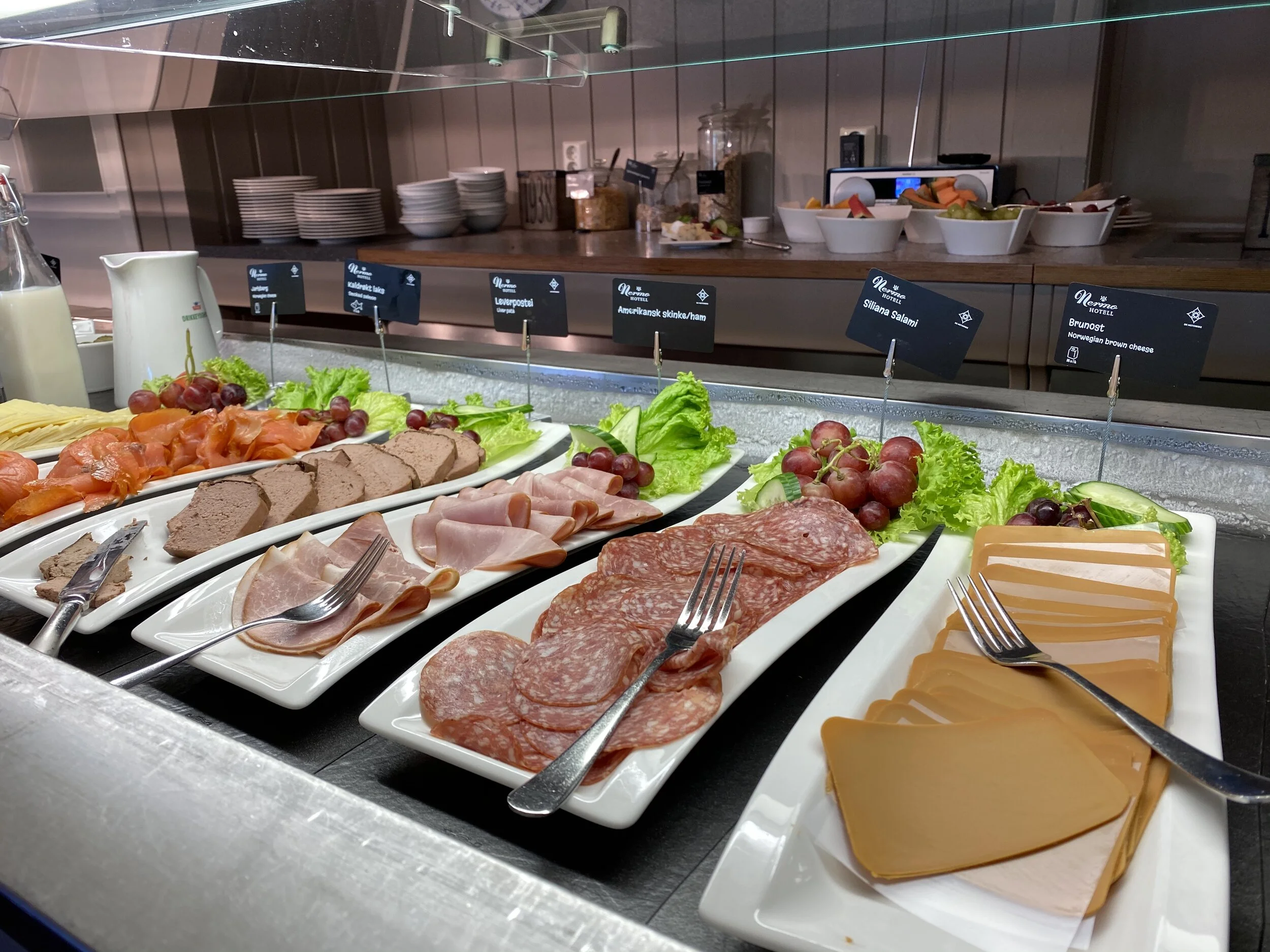 Frokosten ble spist i frokostsalen. Frokosten inneholder stort sett det man forventer å finne på en frokostbuffet. Her savnes flere allikevel muligheten til å velge mellom ulike sorter brød, samt syltetøy som ikke er fabrikklaget.