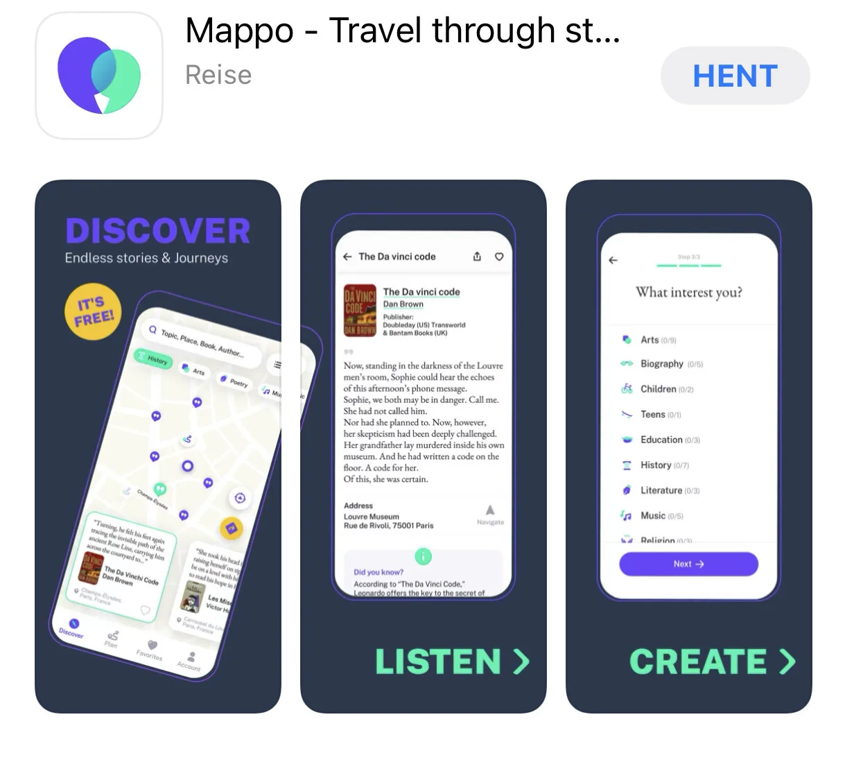 Mappo er en annerledes måte å utforske verden på. Her deles det spennende lydinnhold fra blant andre litterære ikoner, historikere, forfattere og musikere om stedene du kjører forbi. Den inkluderer også forslag til kjøreruter tilpasset dine interesser. Tipsene blir hele tiden flere, da mennesker fra hele verden kan legge inn sitt innhold.