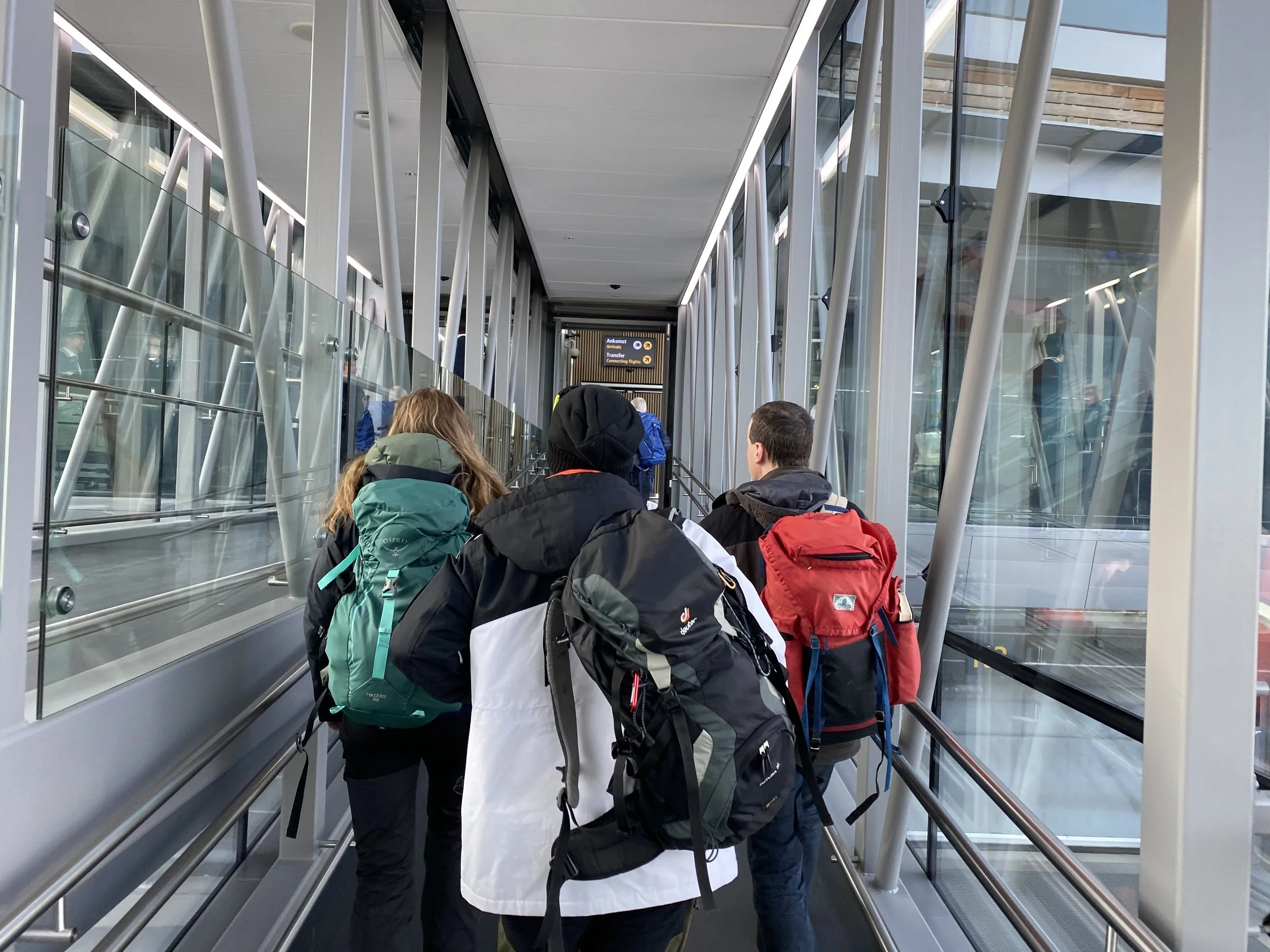 FINN TRE FEIL: Her er tre representanter fra ryggsekkmafiaen på vei inn til flyet. Det går aldri bra. Foto: Odd Roar Lange