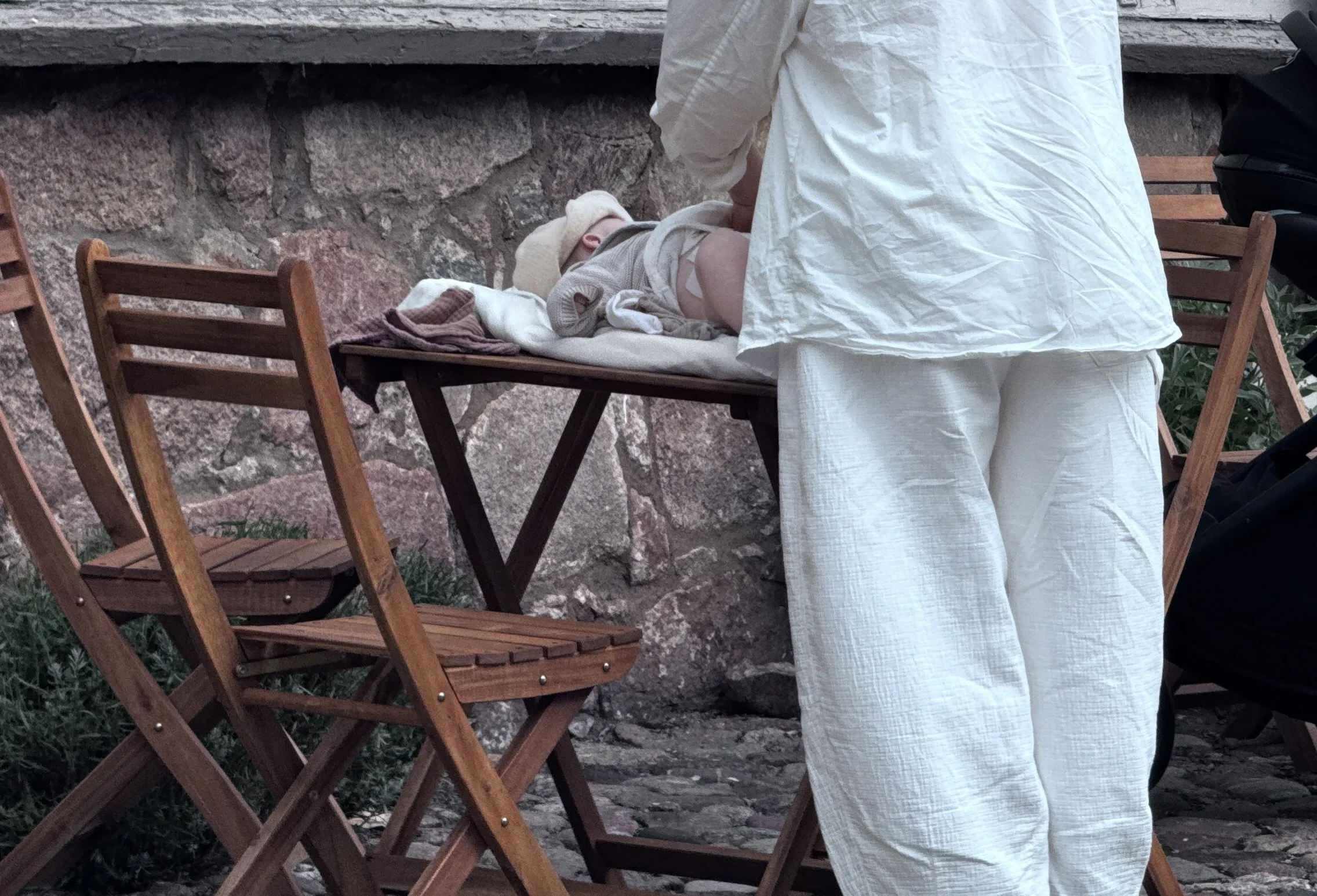Ja, du leste riktig. Barnet ble lagt på bordet der andre gjester spiste. Bæsjebleien ble tatt av og skiftet midt blant kaffekopper, tallerkener og glass. Alt sammen skjedde som om det var verdens mest naturlige ting – uten det minste snev av diskresjon. Ingen hensyn til de rundt, ingen tanke på hva dette bordet egentlig var til. Bare fullstendig ignorering av både folkeskikk og hygiene.