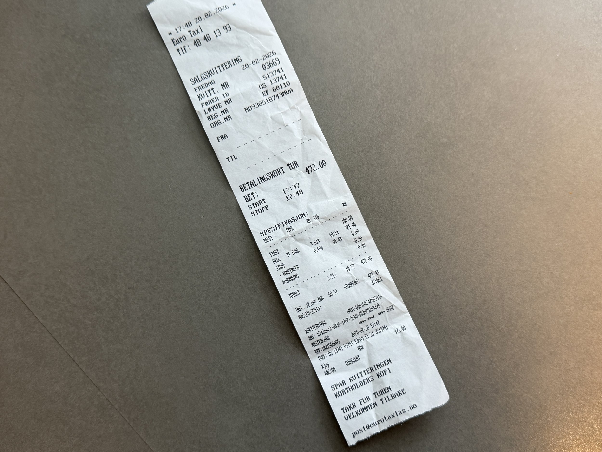Men sjåføren fra Euro Taxi lot meg ikke slippe med «bare 422» kroner. Kan la på 50 kroner for bompenger!