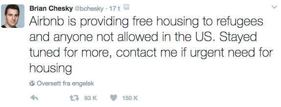 " Å nekte flyktninger eller personer fra spesielle nasjoner adgang til USA er ikke riktig. Vi må heller så sammen med dem som er hardt rammet", skriver Brian Chesky på sin twitterprofil.