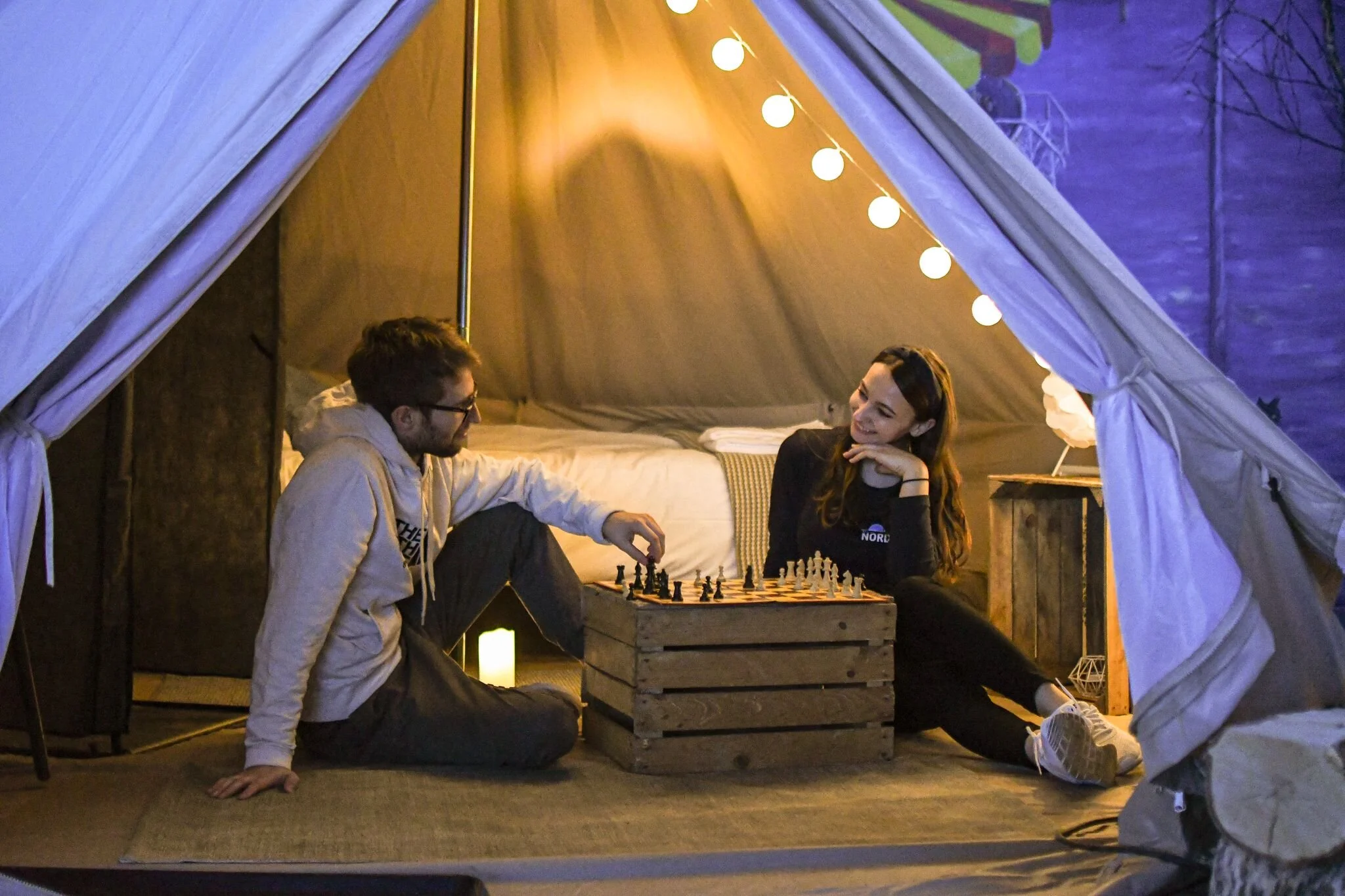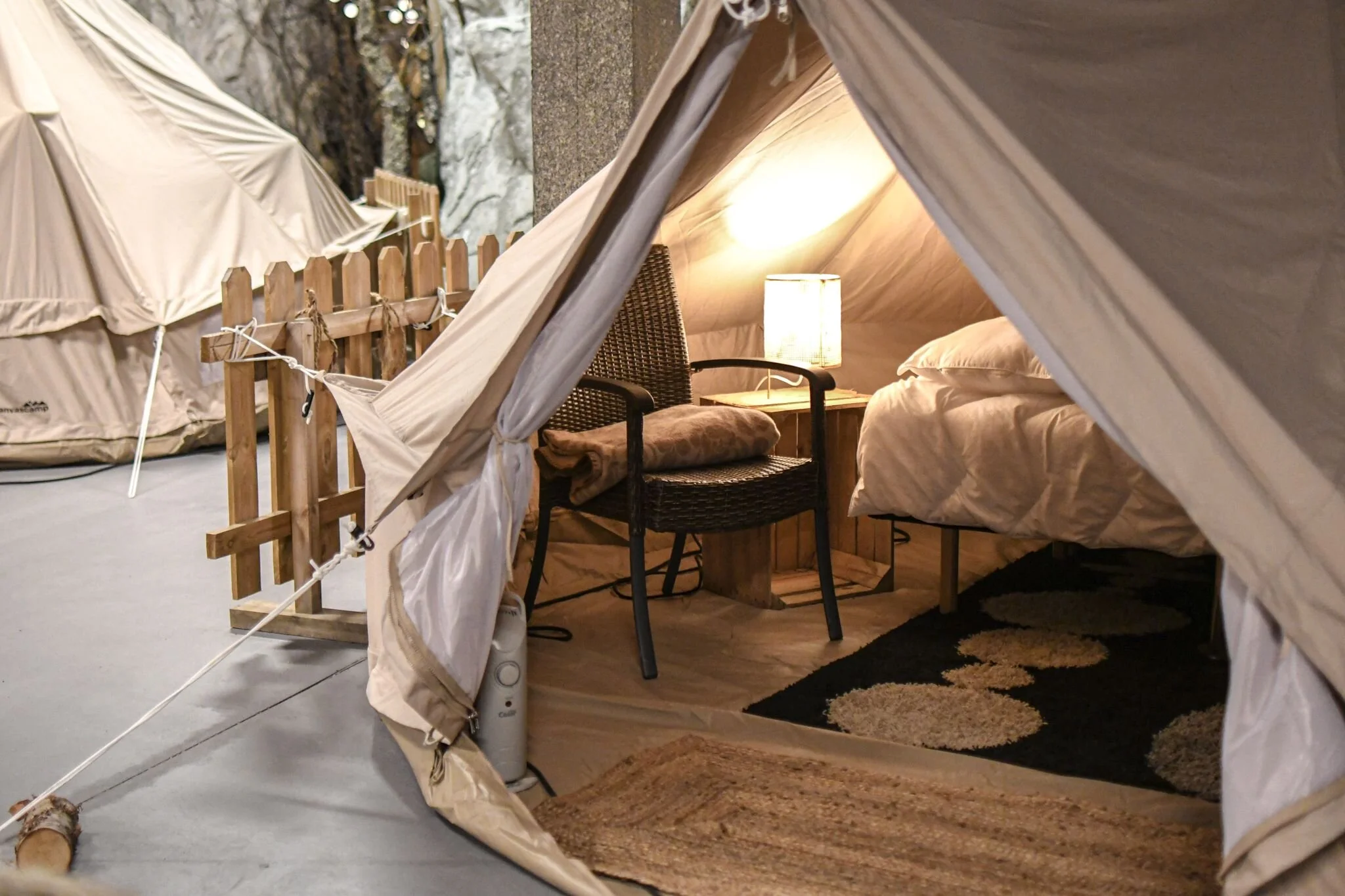 - Etter at alle våre utenlandske turister forsvant 12. mars i fjor, har vi etablert landets første innendørs campingplass på Basecamp Nord like ved Bardufoss, bestående av ulike telt og hyggelige «bålplasser».