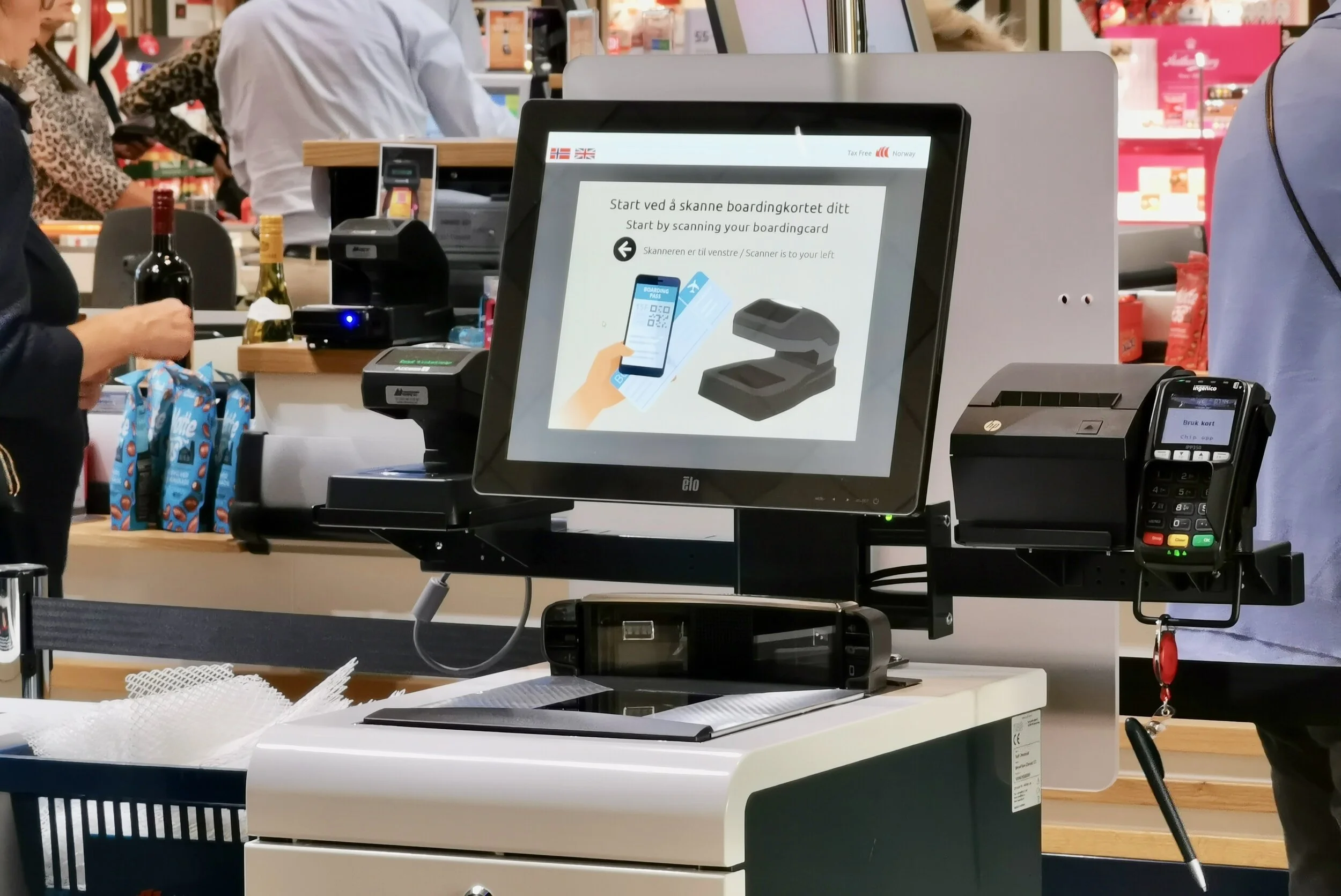 °Gå til kassen og start med å scanne ditt boardingkort (enten papirvarienten eller fra mobiltelefonen)