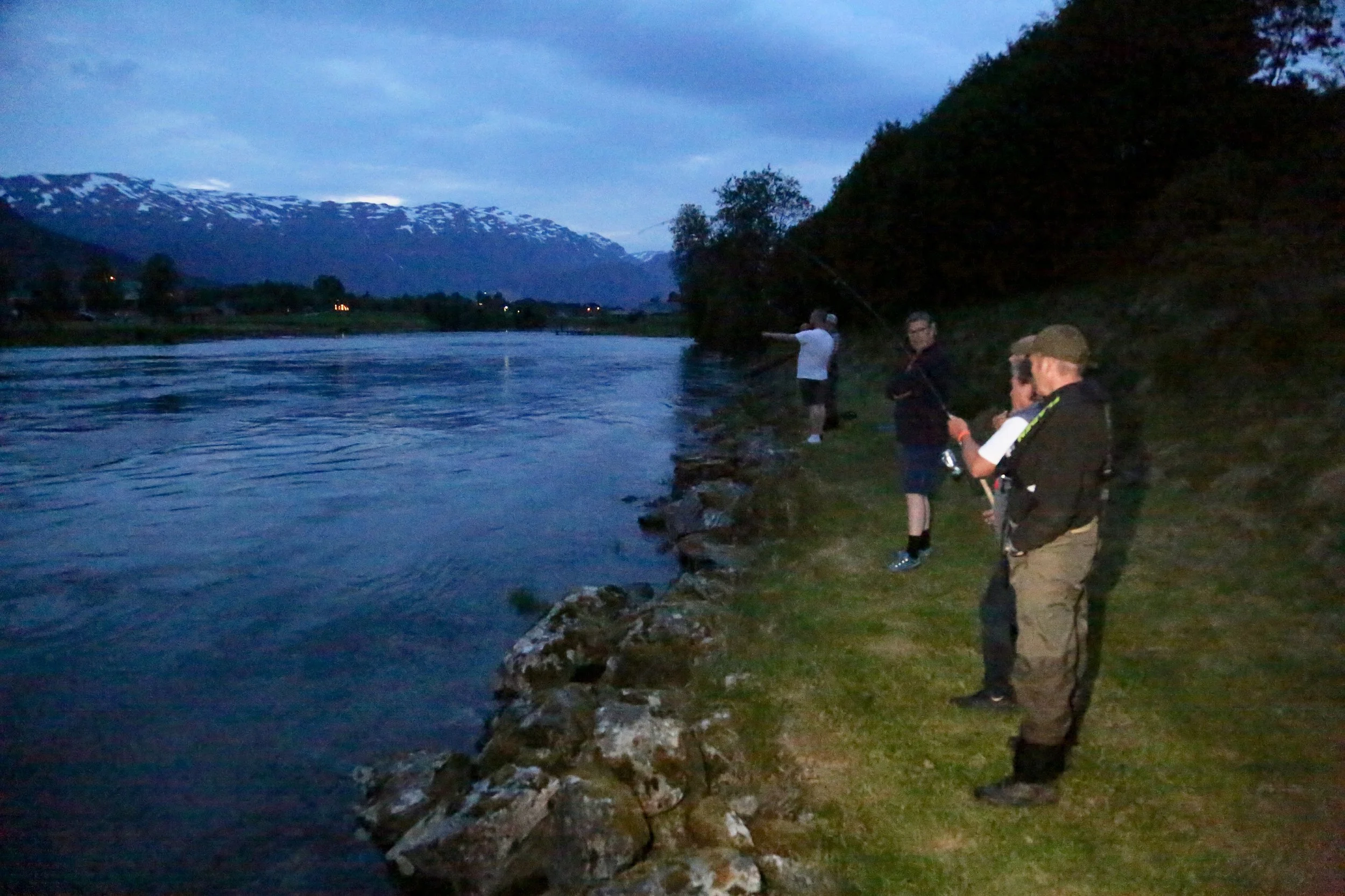 Rekordvarmen i mai satte virkelig fart på snøsmeltingen i fjella rundt Gloppefjorden. Og vannmengden i elva er stor når kameratgjengen fra Bergen, Oslo, Bærum og Gloppen er på plass ved elvebredden klokka 00.01 natt til 1. juni. Det er klart for årets absolutte høydepunkt. Starten på laksesongen. Noen fisker med flue, andre velger sluk. Det er trukket lodd om hvem som skal stå hvor. North Pole, South Pole, Corner, fiske fra båt. Loddtrekningen ble akkompagnert av kvikke kommentarer, historier fra svunne år, en fornøyd skål og stigende forventning. Nå er det endelig tid for ømhet - ved elva.