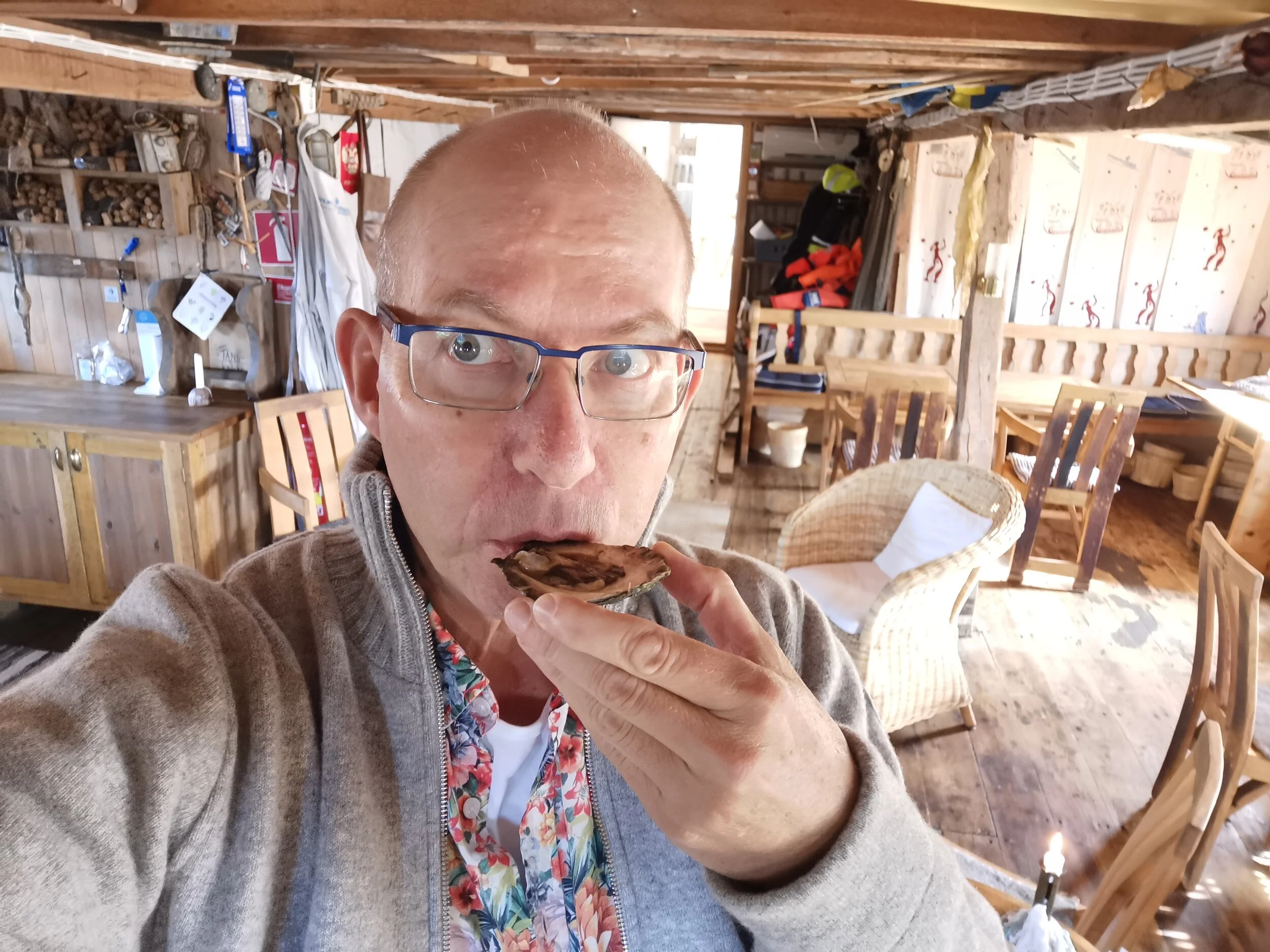 Dersom du allerede elsker østers så kommer du til å stortrives her. Dersom du er «nybegynner» og mer usikker på smaken så kan du få Hanna til å gi deg en innføring i både historien, marinbiologien og hvordan du åpner et østersskjell. Du kan få servert champagne til, eller kanskje drikke det spesiallagde mørke ølet, Östronporter. Herlig!