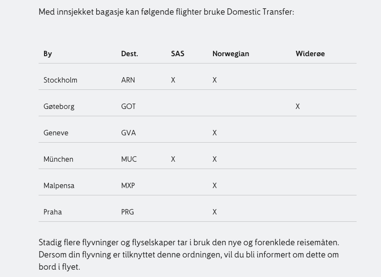 I første omgang gjelder ordningen for de som reiser via Oslo Lufthavn med SAS, Norwegian eller Widerøe. Ordningen gjelder kun for passasjerer som reiser med gjennomgående billett. Det betyr at bagasjelappen din er merket med sluttdestinasjonen og ikke med «OSL» når du sjekker inn i utlandet.