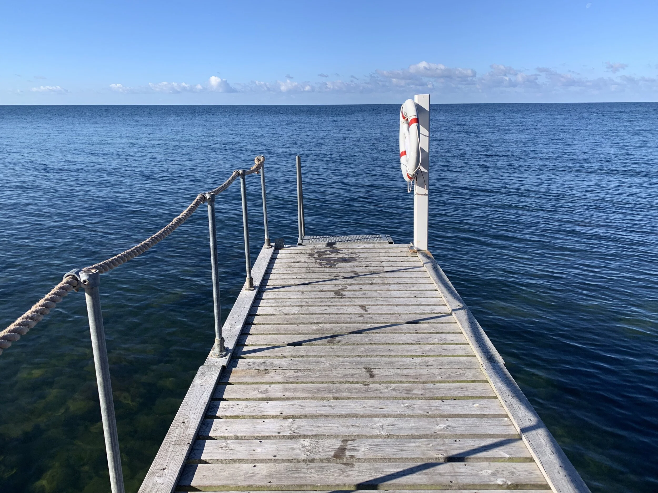 Fra hotellet kan man rusle ned den vakre grusgangen mot sjøen, for et morgenbad eller kanskje for et svalende bad i solnedgangen en sen sommerkveld.