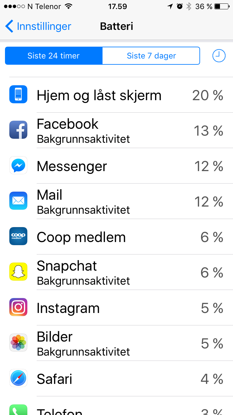 Nå kan du også skyve knappen til høyre, og da får du opp hele oversikten over hva du har brukt batteri på. Du kan velge de siste sju dagene eller bare de siste 24 timer. Dette velger du i fanen helt øverst i dette bildet.