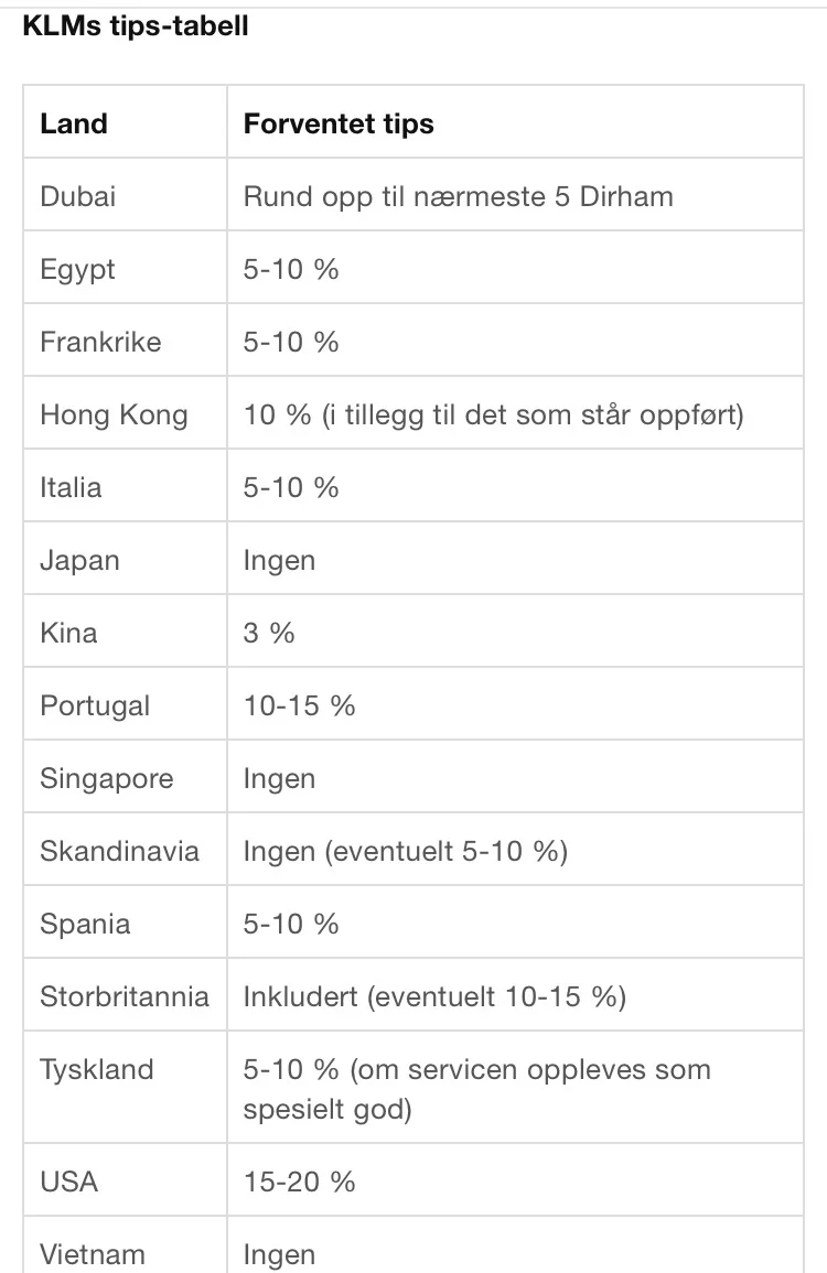 – Hvor mye du skal betale i tips varierer fra land til land. Det kan være greit å undersøke litt på forhånd for å vite hvem som skal ha tips og hvor mye du skal gi. For mye er ikke nødvendigvis bra, og ikke for lite heller, sier Carina Bergqvist pressekontakt for Air France og KLM.
