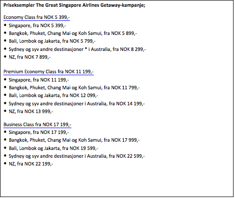 Akkurat nå er det flere selskaper som kjører kampanjetilbud. Et av dem er Singapore Airlines, som med kampanjen «The Great Singapore Airlines Getaway» har gode priser til blant annet langreisemål som Australia, New Zealand, Thailand, Vietnam, Malaysia og Bali.
