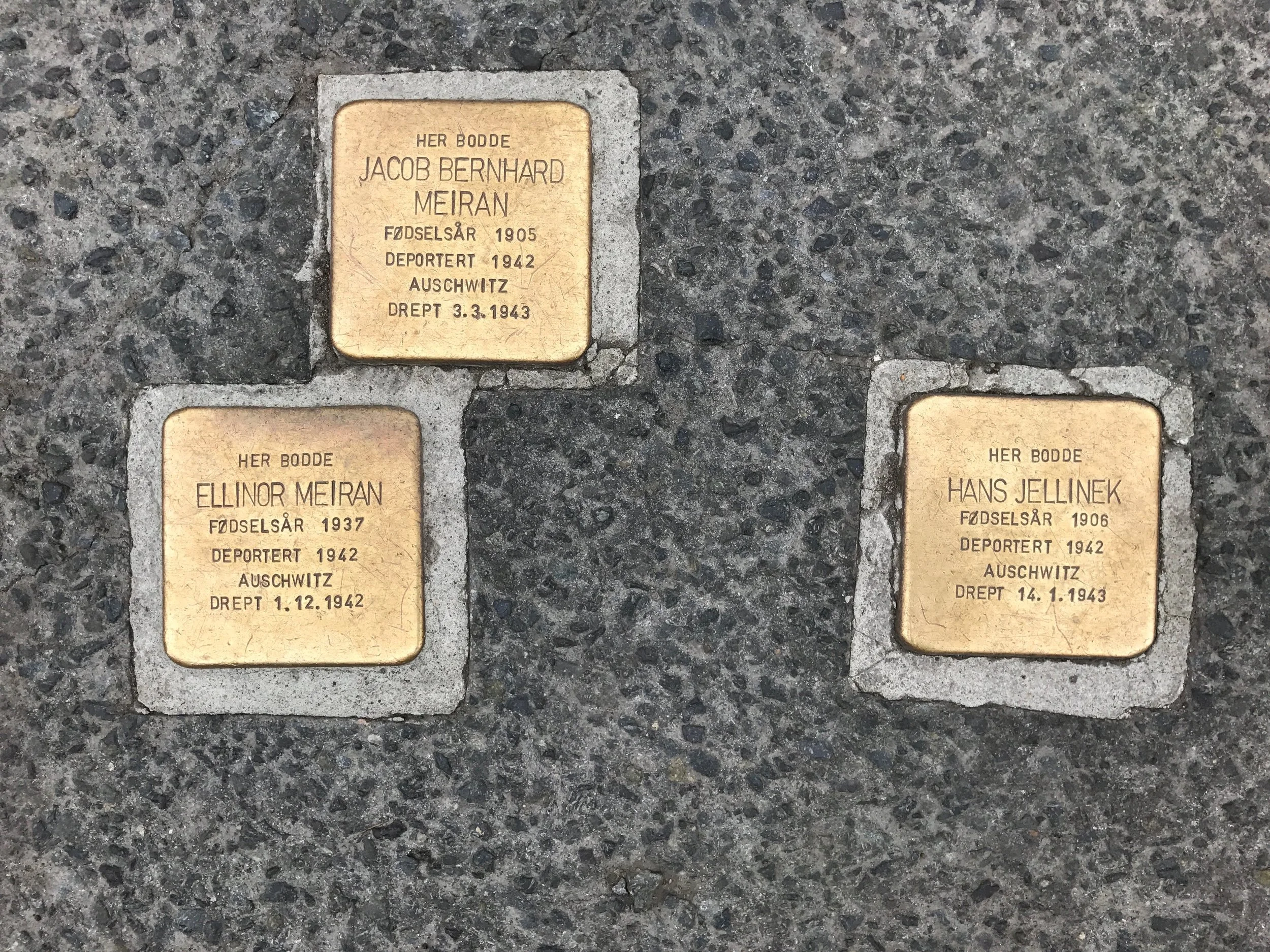 Og selv om du stikker inn Rosenborggata og tar turen til Fagerborggata/Pilestredet så er det også lett å gå glipp av noe viktig: Nedfelt i asfalten - utenfor nummer 15 - ligger disse tre «steinene», som er såkalte snublesteiner.
