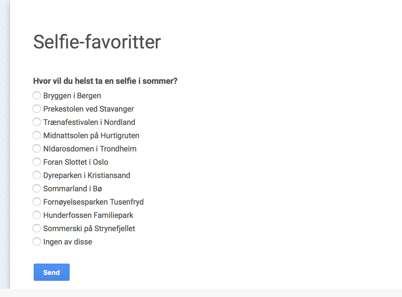 Nå er det neppe noen som har foretatt en helt eksakt måling om hvor de fleste bildene virkelig er tatt. Men i nordmenns drømmer så er Hurtigruten på selfietoppen. Det er iskremprodusenten som i sommer gjennomførte undersøkelsen der de ba leserne om å stemme på det stedet de aller helst ville ta en selfie. Hurtigruten ble vinneren, skriver Aftenposten Reise i denne artikkelen.