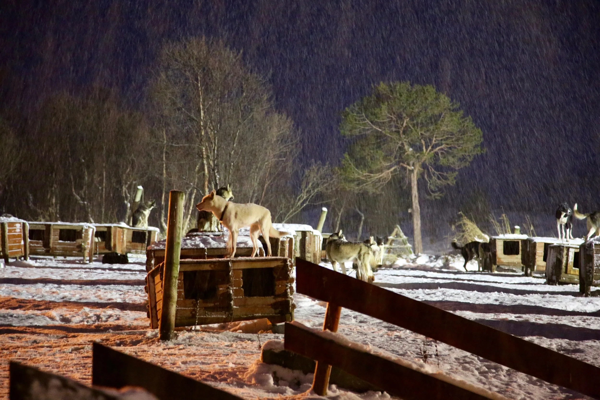 -Snøen kom for tre dager siden, så vi er såvidt i gang med sesongen, sier Sofie. Hun har spent åtte hunder for sleden og har allerede unnagjort to runder med turister på den seks kilometer lange runden som er oppkjørt for kvelden. Dagslyset er på kortvarig besøk på denne tida av året. Derfor er gode hodelykter nødvendig for hundeførerne. Vi, gjestene, klarer oss med varme klær og et stort smil.