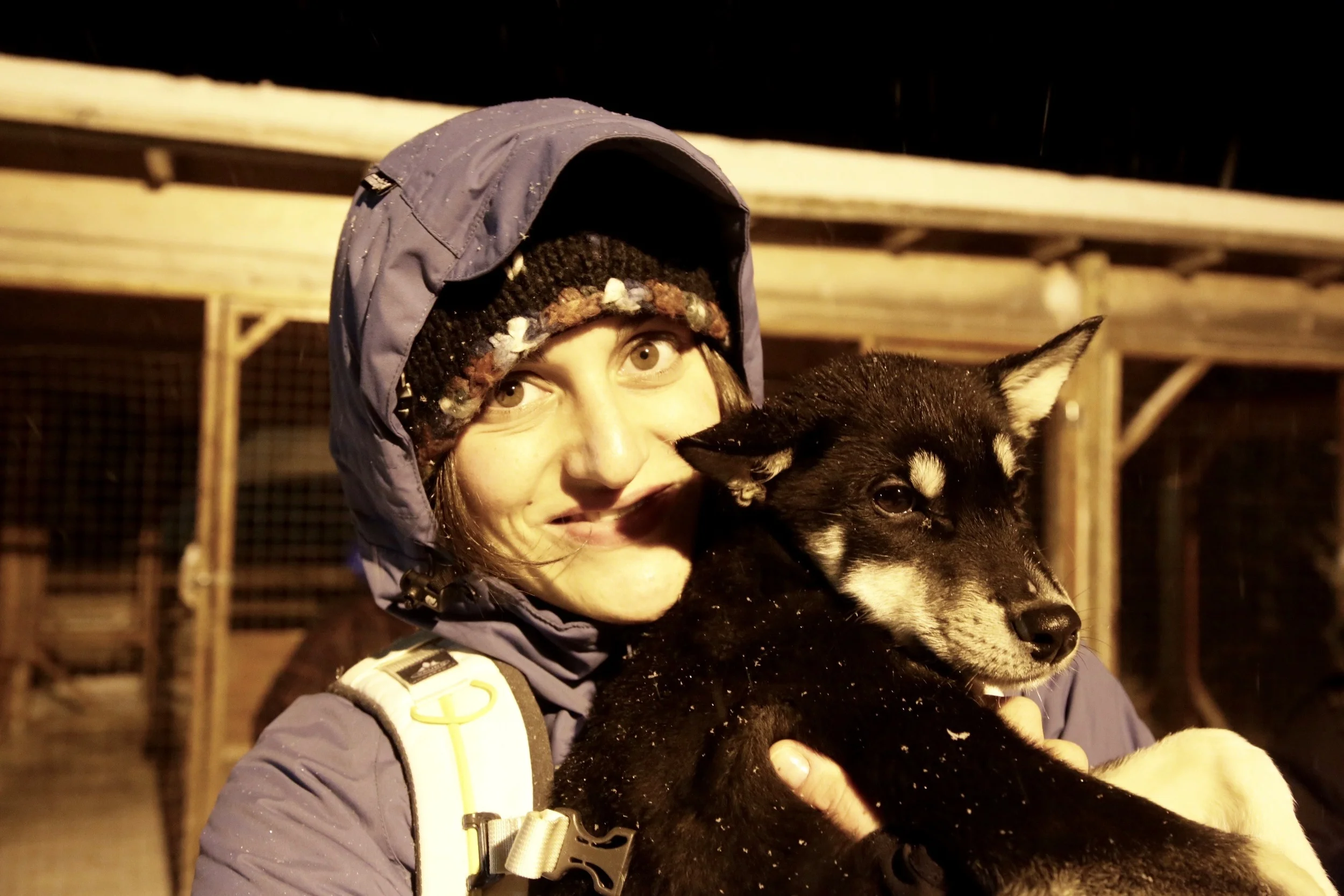 I en av inngjerdingene ved villmarksleiren venter kveldens søteste opplevelse: syv flotte og lekne valper som foreløpig sosialiseres ved å være sammen med hverandre, sammen med hundepasserne og får møte turistene. Men pass på alt løsøre, Hundene er svært kosete og veldig nysgjerrige og de stikker bokstavelig talt gjerne snuten sin ned i lommene dine for å finne noe å leke med. Min notisbok levde farlig en stund.
