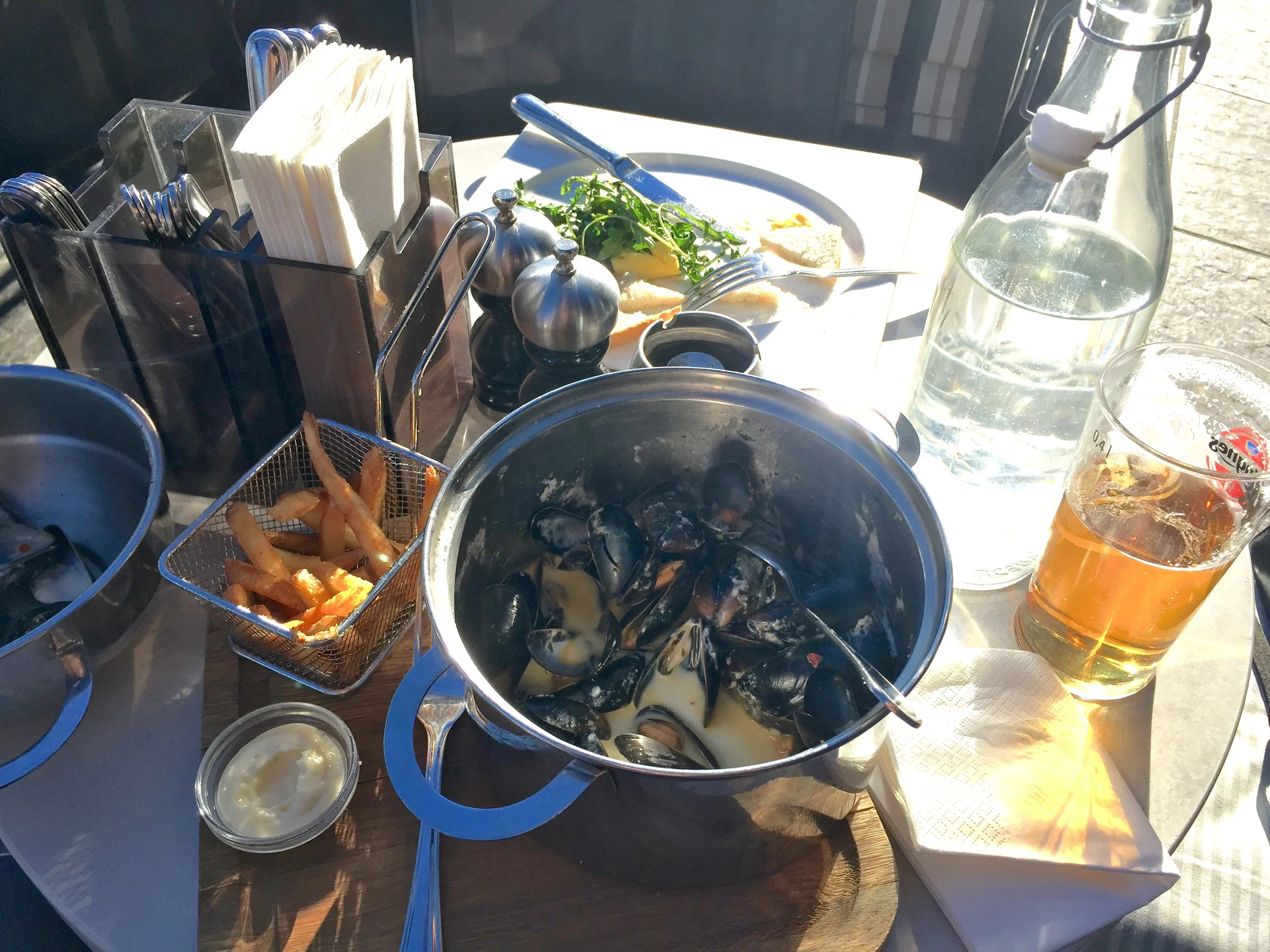 Det er vårsol på Aker Brygge. Uterestauranter som skal stille med bord og servering i sola har gode dager. Det er tid for moule frites (Blåskjell og pommes frites) og en øl. Det er god stemning. Lenge.