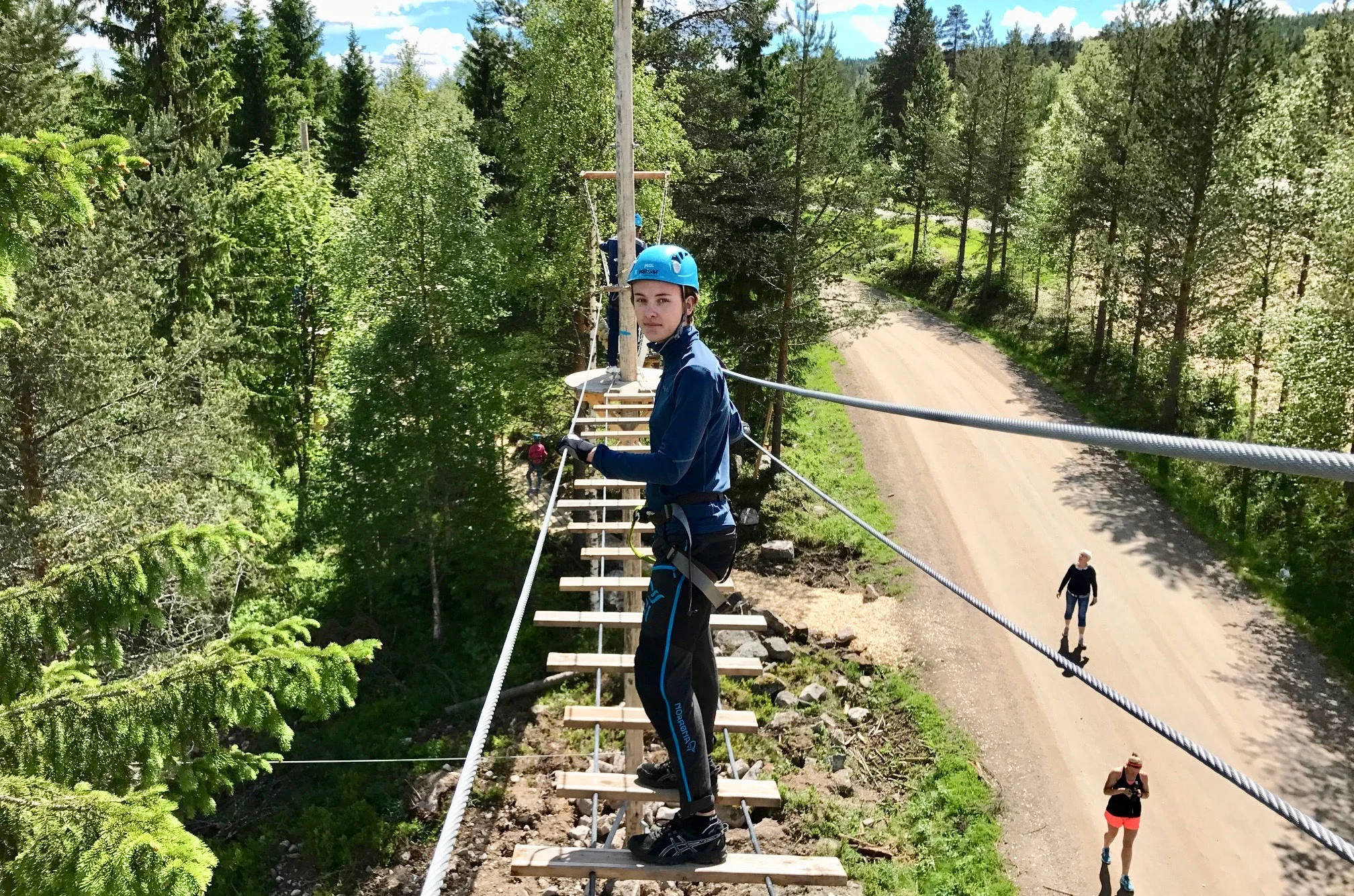 Like ved startområdet til Gullia sykkelarena finner du klatreparken til Høyt & Lavt. Vi testet den etter et apr dager i sykkeltraseene, og fikk kjenne både magesuget, testet ballansen og kjent store og små utfordringer. Høydeparken er er fin familieaktivitet. Dere får låne både hjelm og sikkerhetssele, men ta med egne hansker (bruk de samme som du brukte til stisykling). Også klatreparken har gradert løypene etter ferdighetsnivå og ønsker om nivå på utfordringer. Dere får en god introduksjon før dere slippes ut i parken.