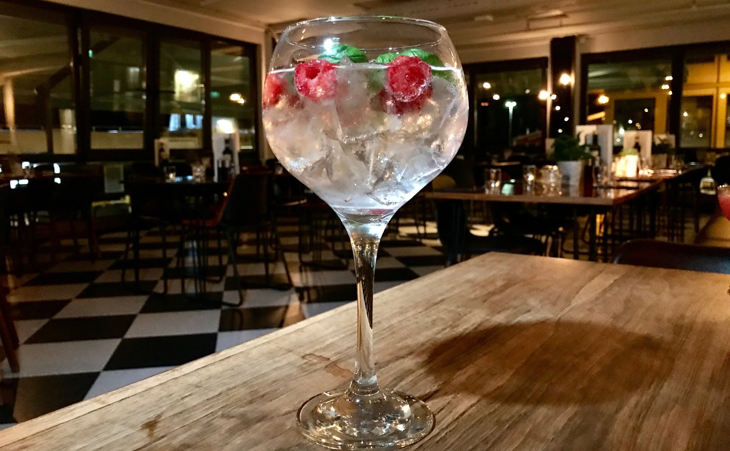 Fyll i et stort vinglass med is, deretter gin og tonic, pynte med bringebær og basilikum.